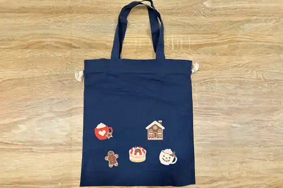 クリスマスモチーフの特殊なデザインシートを使って、自由にデコレーションし、オリジナルのトートバッグをお作りいただけます。 |