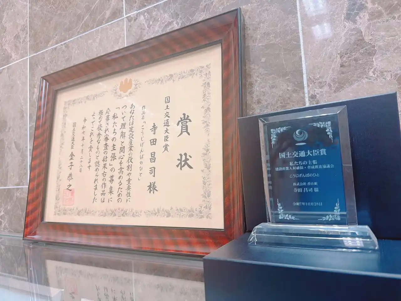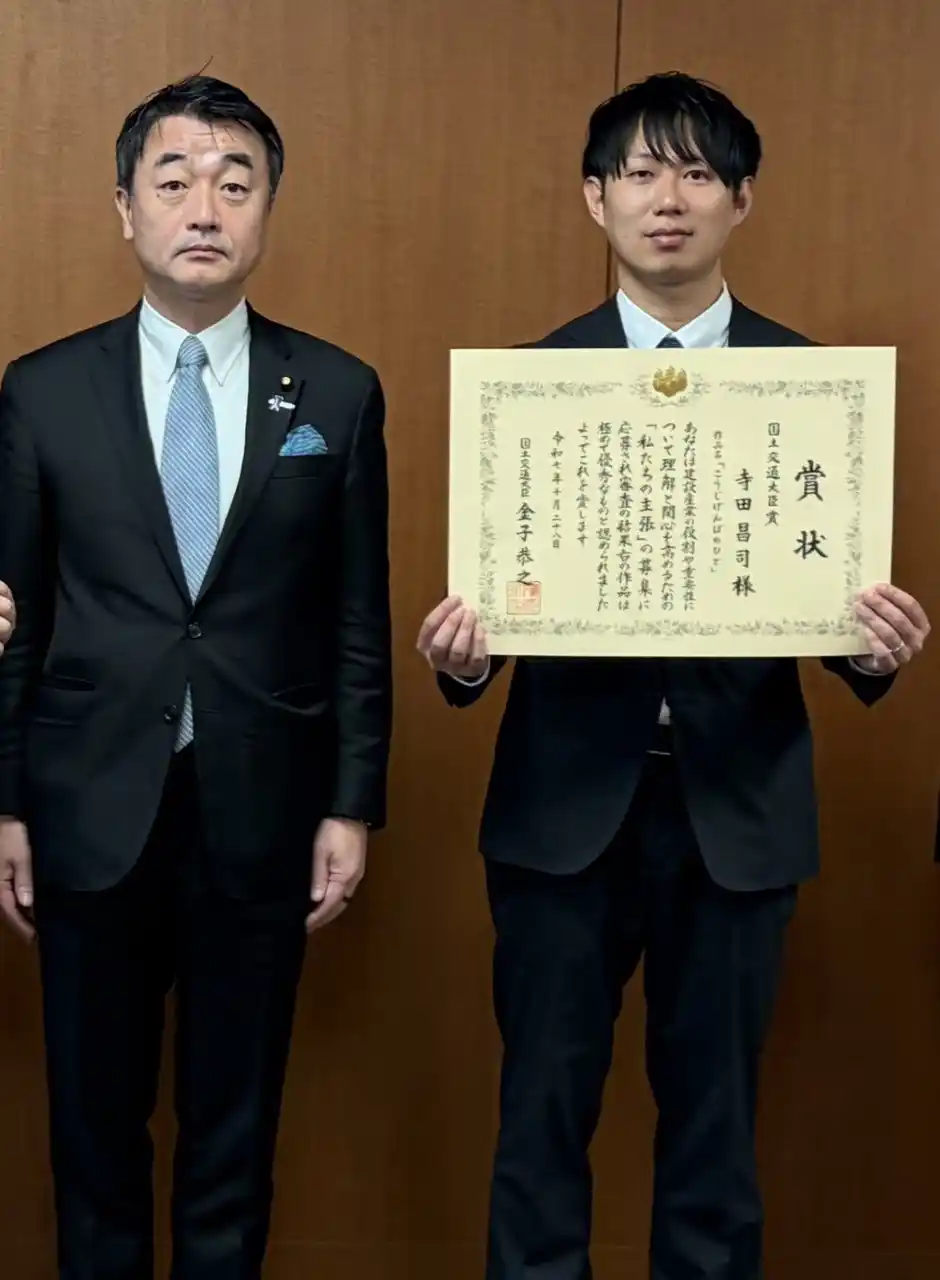応募総数452作品の中から最上位賞の受賞となり、同氏は、令和7年10月28日(火)に開催された表彰式にて、佐々木副大臣より国土交通大臣賞の表彰状を授与されました。 |