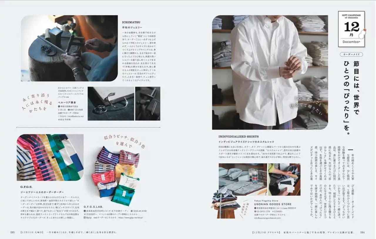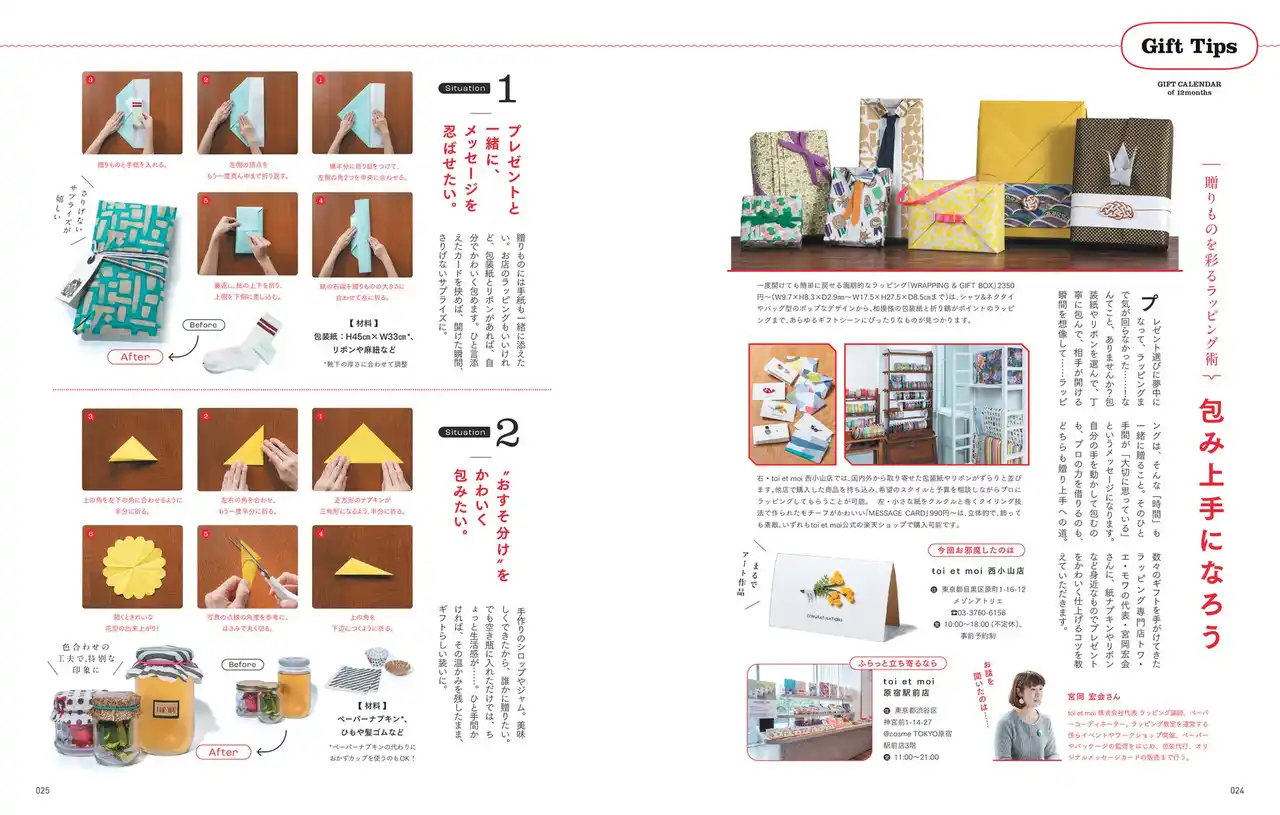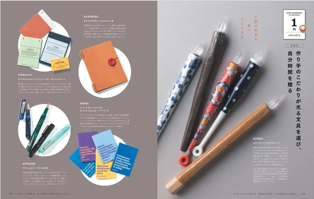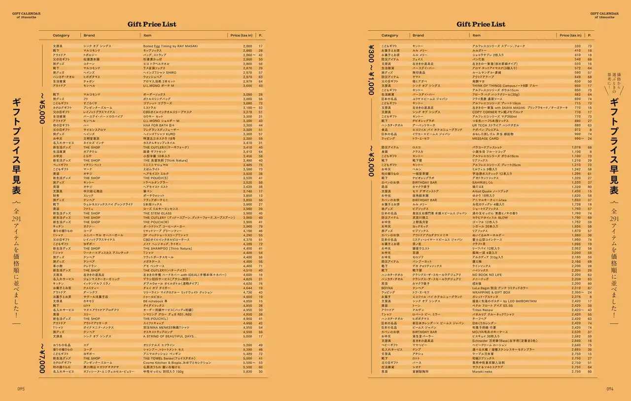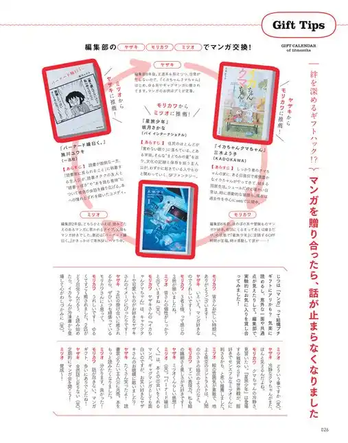 | 月ごとのギフト提案のほかに、コラムページも充実。ラッピング指南や漫画を贈り合ってみる提案、言葉を贈るストーリーの紹介、巻末には価格帯からギフトを逆引きできる”ギフトプライス早見表”まで、知っておくと役に立つ&贈ることがいっそう楽しくなる誌面コラムにもぜひご注目ください。 | |||||||||||||