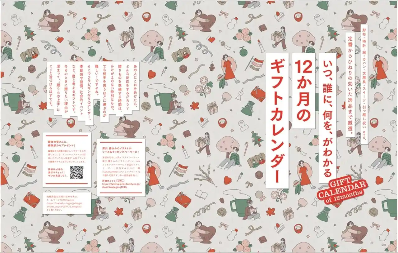 | 3人のプレゼント交換が目を引く表紙や、ラッピングペーパーをイメージした特集扉ページなど、深川 優さんのチャーミングなイラストも要注目です。 | |||||||||||||