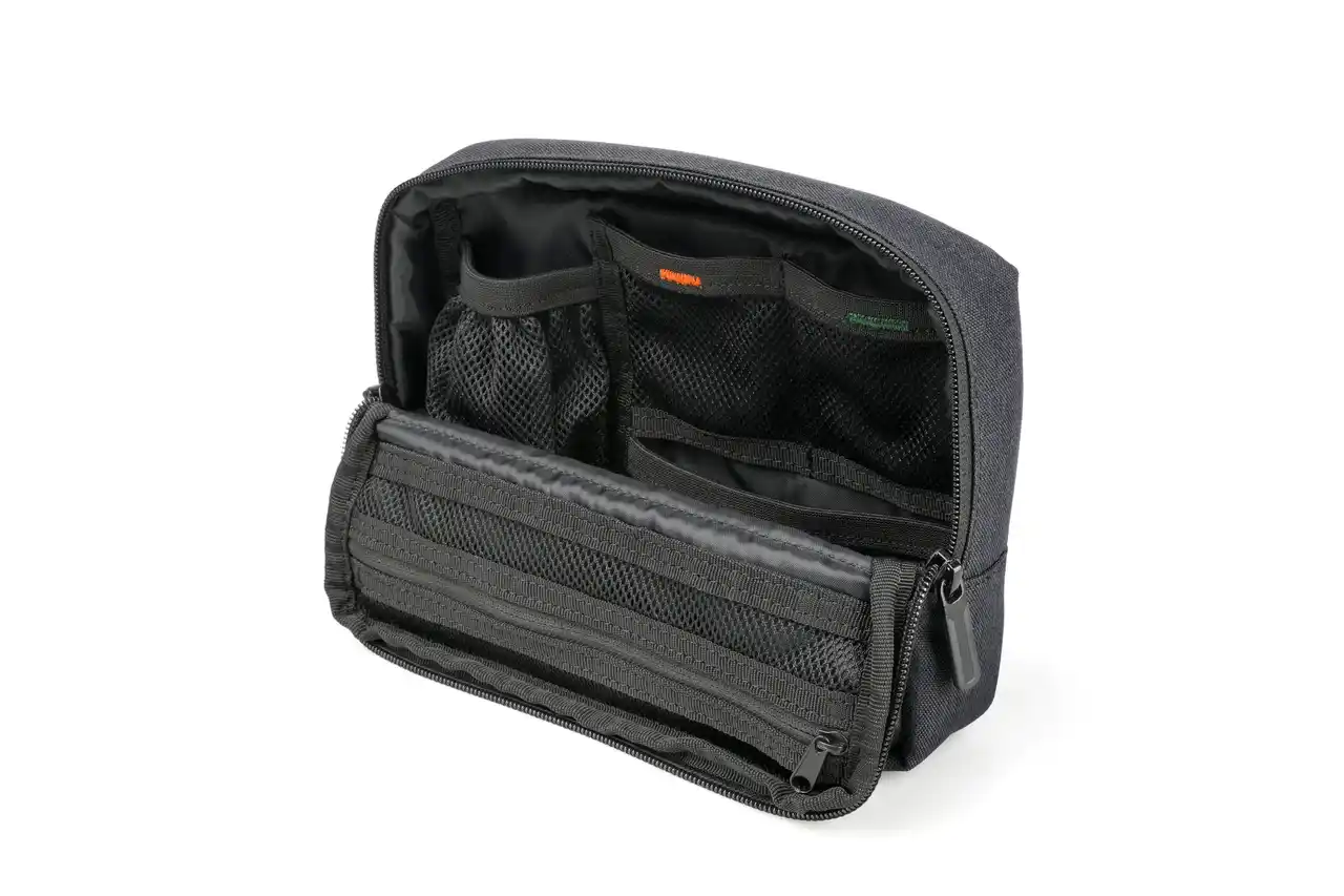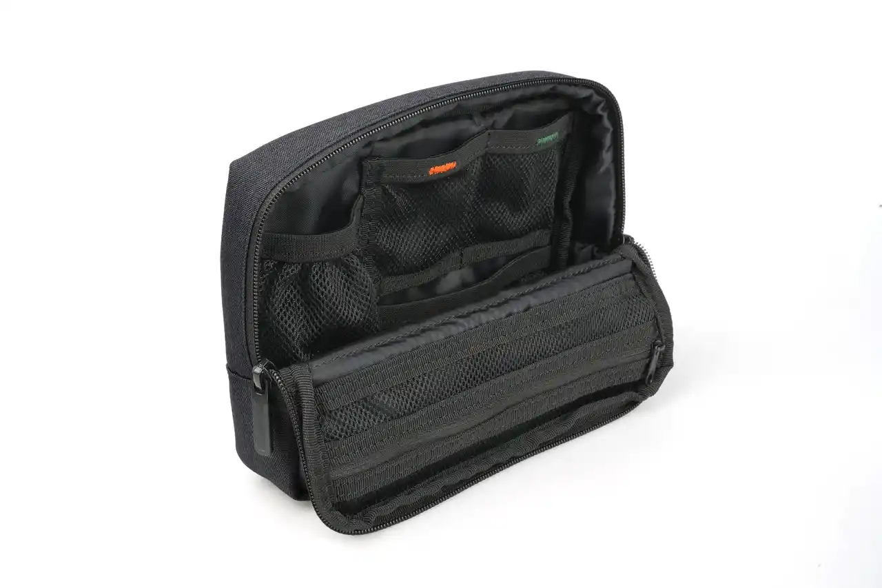 内部には細かな仕切りやネットポケット、ゴムバンドを配置。収納するアイテムに合わせてレイアウトを自由に調整でき、機材をすっきりと整理できます。シーンを選ばず使いやすい、シンプルですっきりとしたデザインも特長です。 |