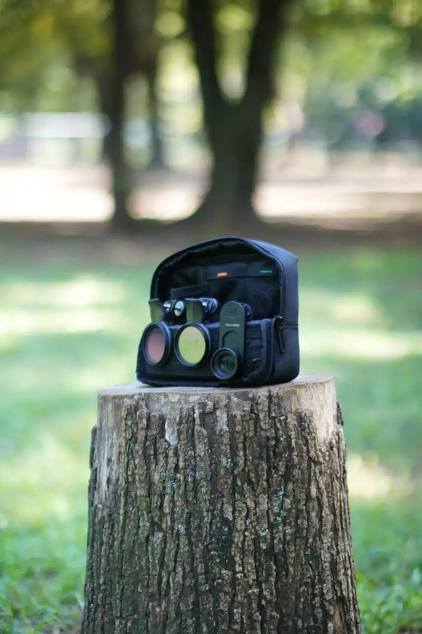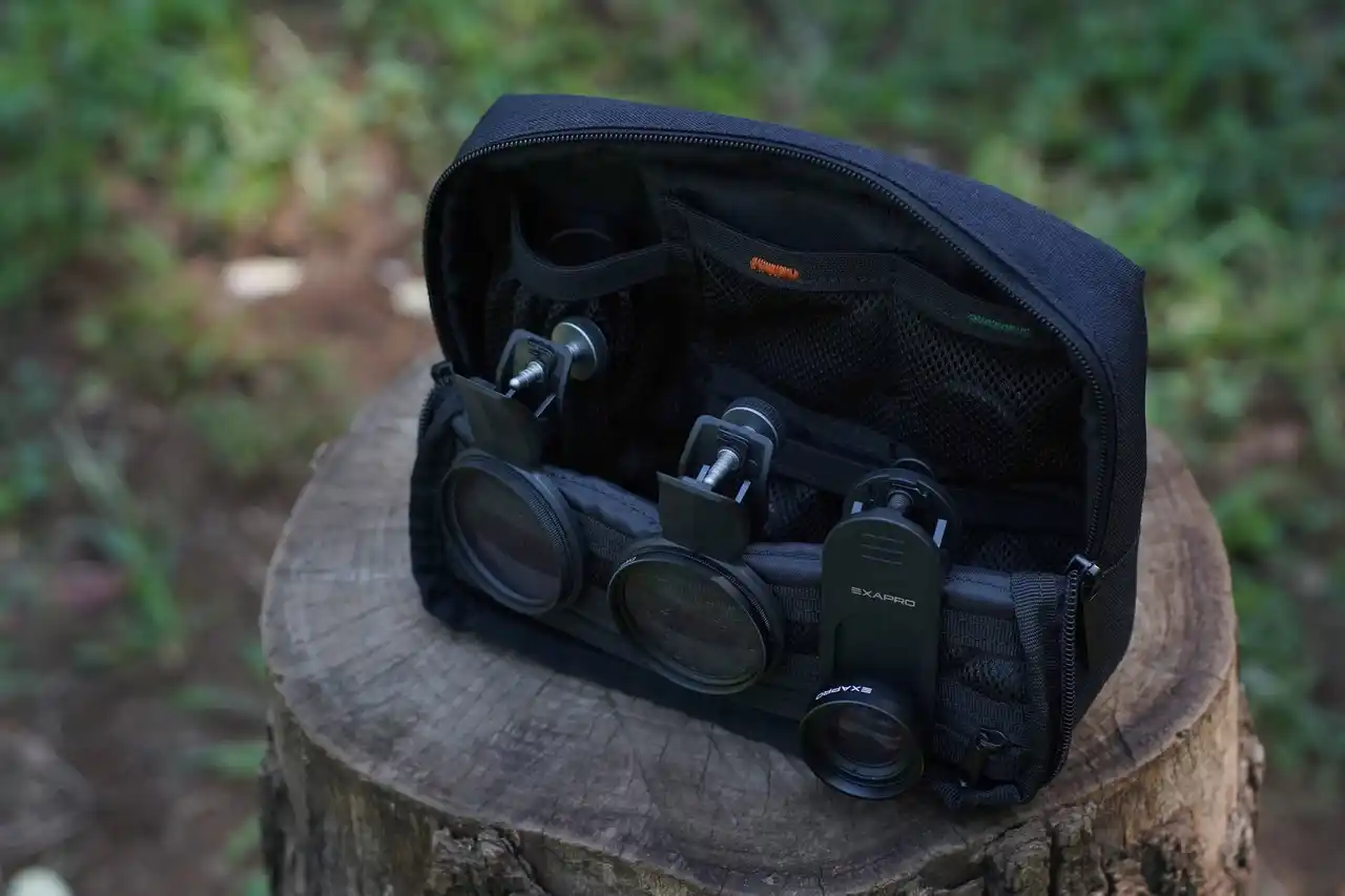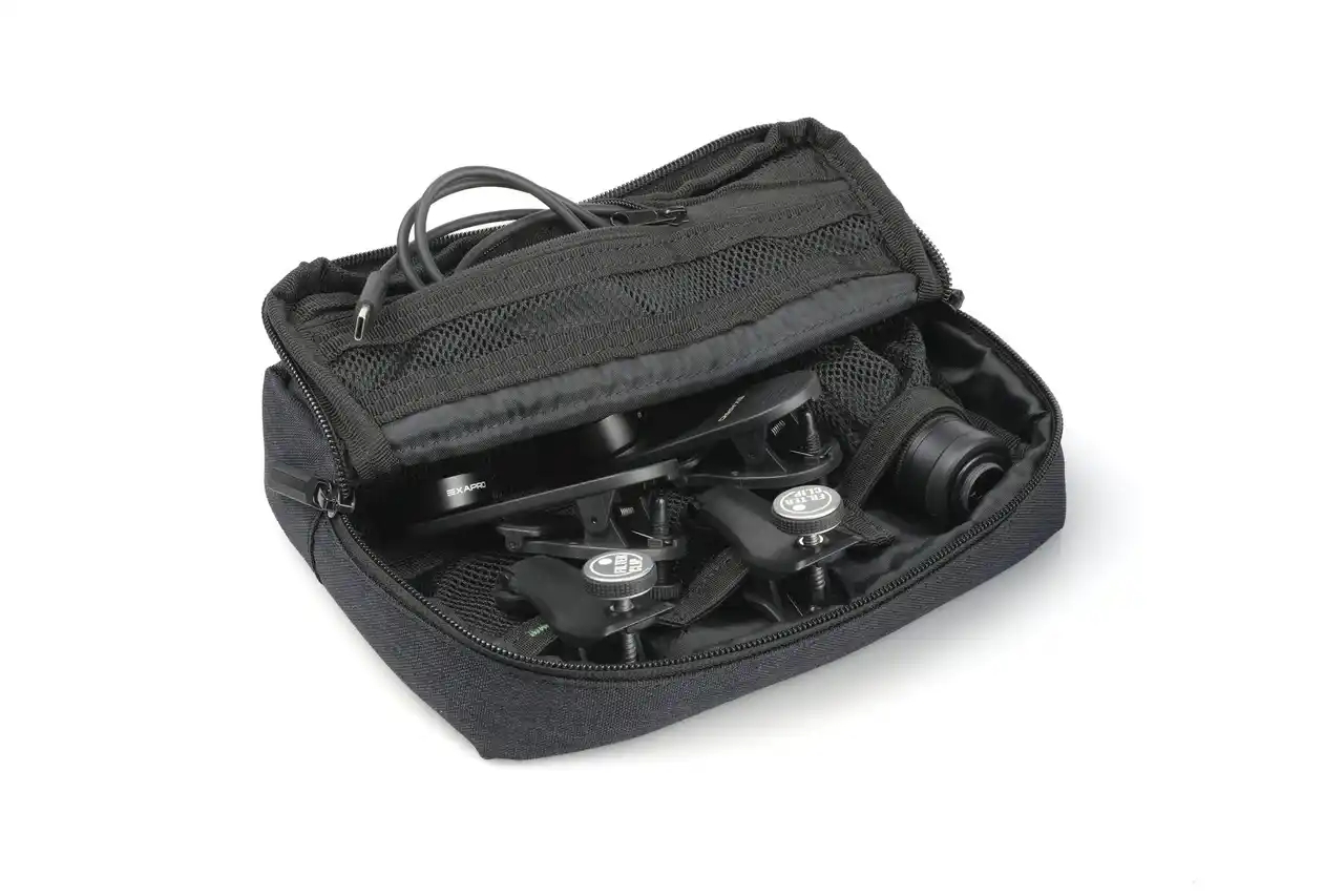 EXAPROシリーズのクリップレンズやフィルタークリップ、マグネティックモバイルスタンドなどを同時に収納可能。クリップレンズは、ポーチ内部のゴムバンドに引っ掛けることで、移動時も安定して収納できます。 |