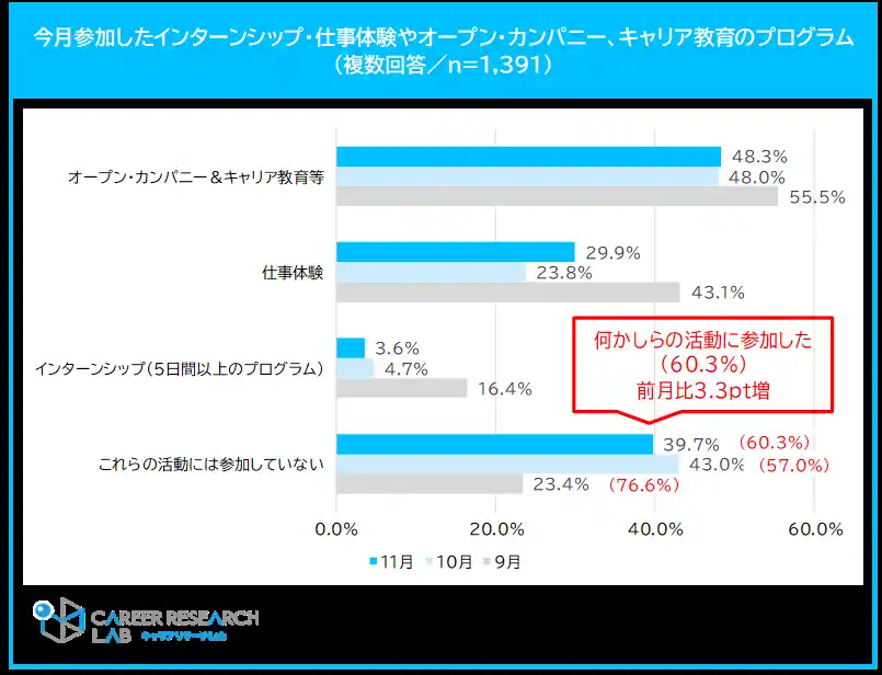 11月のキャリア形成活動参加率は60.3%で、前月より3.3pt増。27年卒予定の大学生は「流動性の高い雇用」よりも「終身雇用」を希望