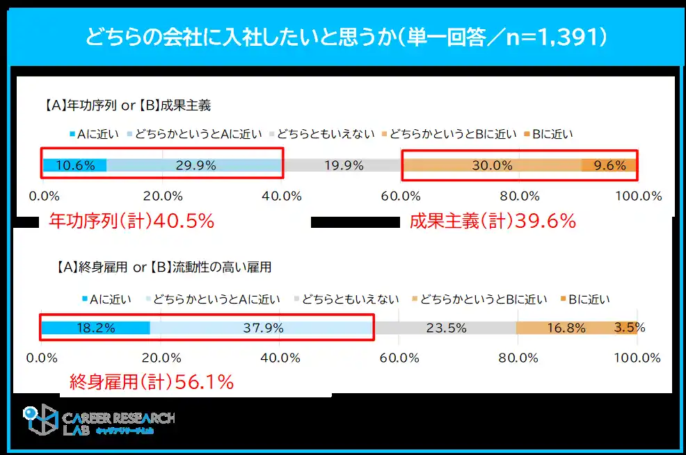 評価方法に関しては、「年功序列」か「成果主義」のどちらの制度がある会社に入社をしたいか聞くと、「年功序列(40.5%)」、「成果主義(39.6%)」となり、ほぼ同じ割合となった。 |