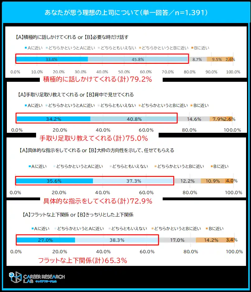 今回の調査から、理想の上司像として「積極的なコミュニケーション」「丁寧な指導」「具体的な指示」「フラットな関係性」を求める傾向が明らかになりました。 |