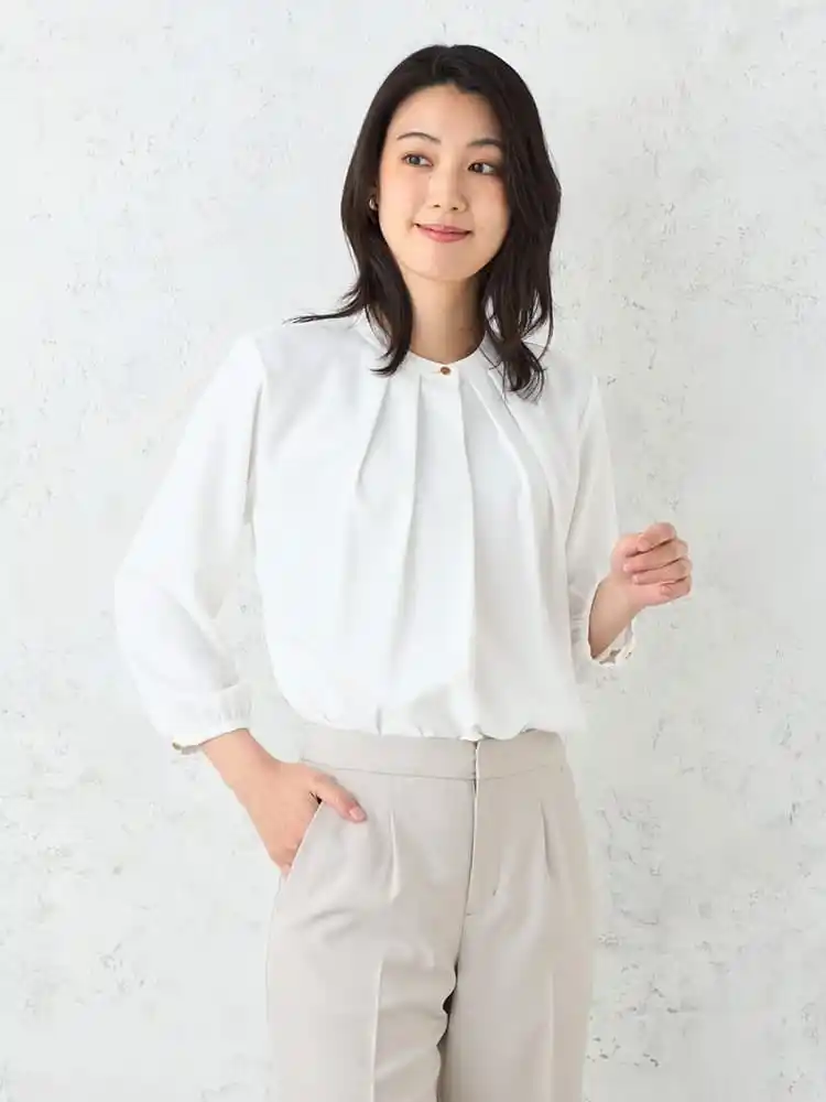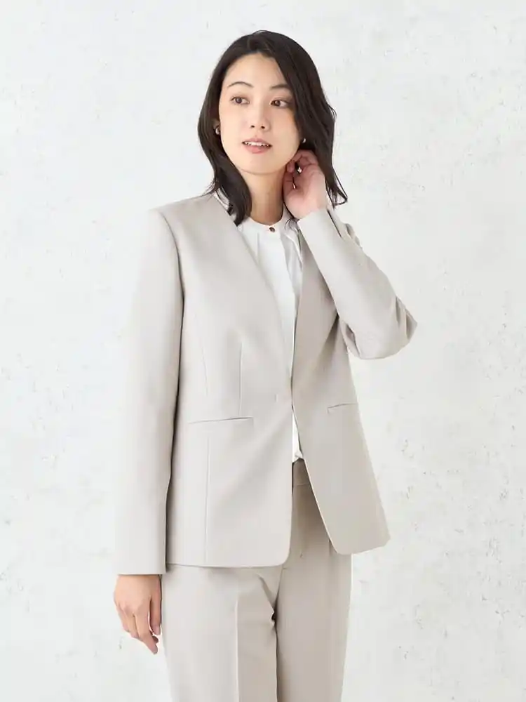 | 4.きちんと感を保ちながらも女性らしい柔らかな印象のノーカラースタイルで、様々なシーンに対応 | ||||||||