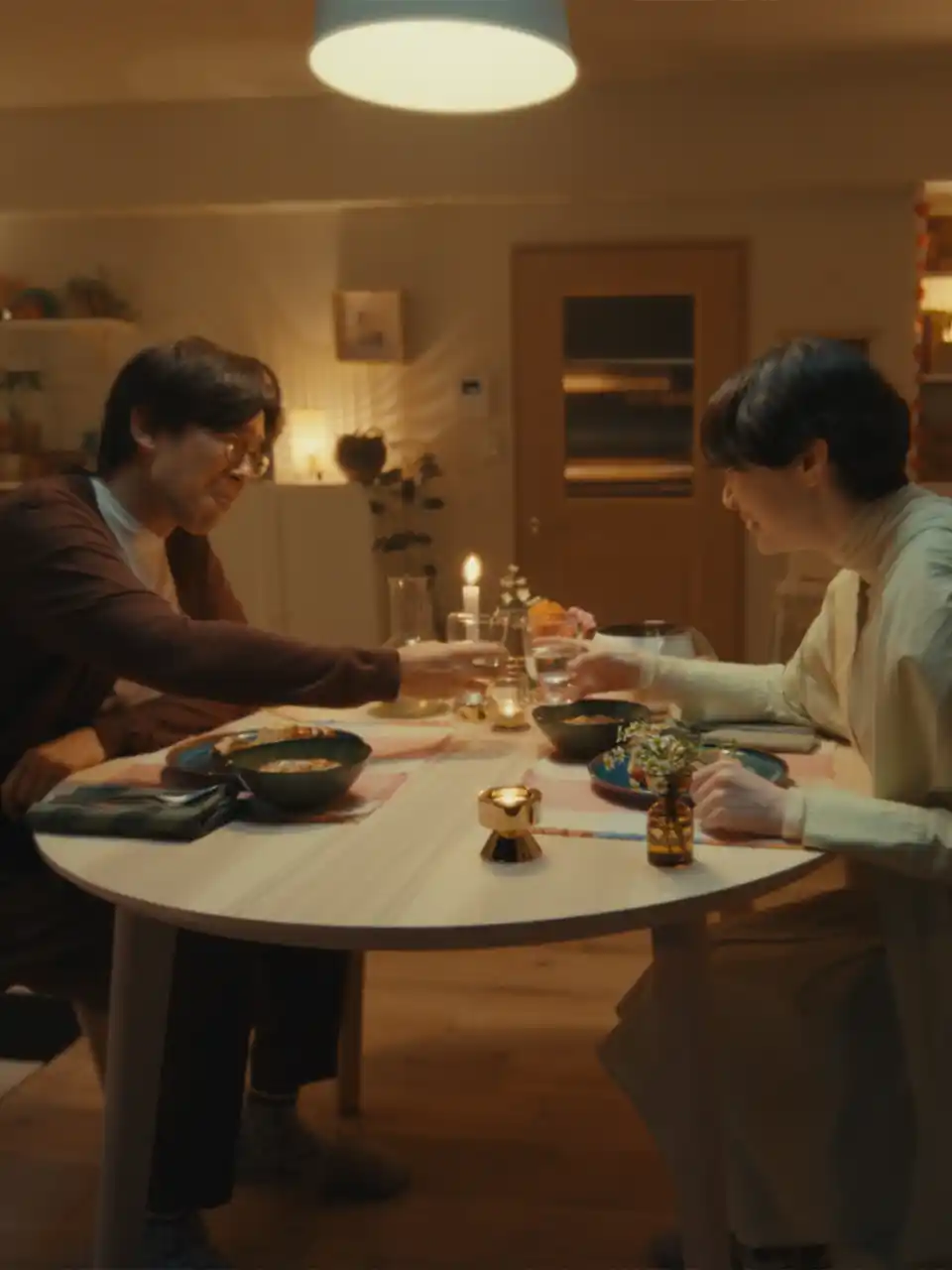TVCM「隠れ家レストラン」篇では、子育てに追われる日々の中でも、お気に入りのテーブル「LISABO/リーサボー テーブル」でちょっといいディナーを楽しむ夫婦を。そしてその同じ世界観の中で、ソーシャルメディアにおいては、色合いが美しいお皿「FARGKLAR/フェルグクラー サイドプレート」を使ってつくり置きをきれいに盛り、食事を楽しむストーリーを展開しています。 |