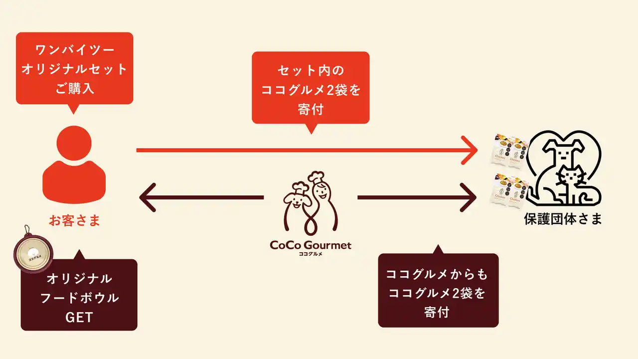 株式会社バイオフィリア(本社:東京都新宿区、代表取締役:岩橋洸太、以下:当社)が展開する愛犬向け手づくりごはんブランド「CoCo Gourmet(以下、ココグルメ)」は、12月12日の「保護わん・保護にゃんの日」に合わせ、チャリティーグッズとして「折りたたみフードボウル」を販売します。本企画は、お客さまがグッズと寄付用のココグルメ・レトルトを購入いただくことで、お客さまが購入したココグルメの数と同数を当社が上乗せし、購入分の“倍”のココグルメを寄付する「マッチング・ドネーション」方式を採用しました。当企画でご購入いただいたココグルメは、当社の動物福祉活動・わににゃるにて支援する動物愛護関連団体さま、保護犬へ寄付されます。
