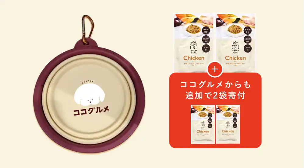 ココグルメチャリティーフードボウルとココグルメ・レトルトを2袋・4袋・6袋から選択し購入いただきます。ご購入いただいた数に応じて、当社が購入数と同じ数をプラスし、保護犬の元に届きます。 |