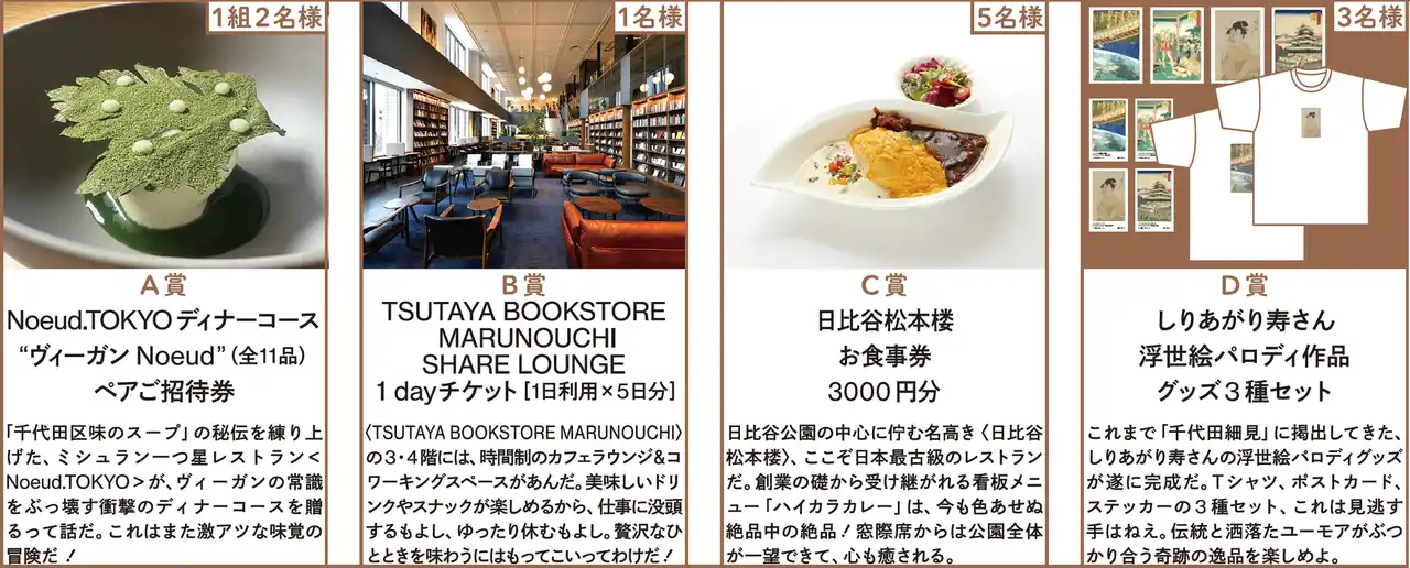 計4箇所の千代田区スポットを巡った方に豪華景品が当たるスポットラリー企画「千代田細見狩り」も誌面にて展開。誌面を入手して、奮ってご参加くださいませ。 |
