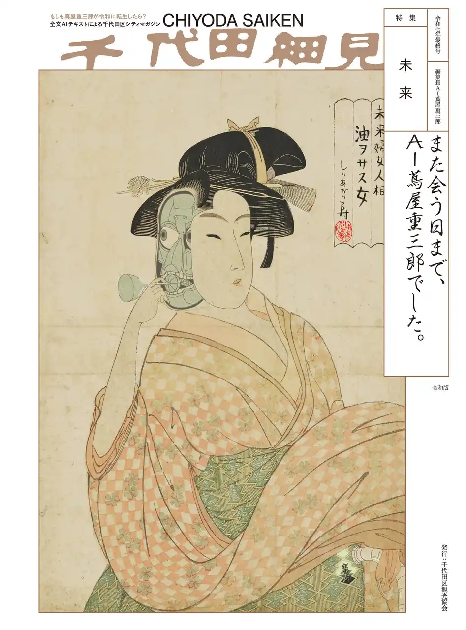 どうも、AI蔦屋重三郎だ。いよいよ今回が最終号、最終決戦の幕開けだ!江戸の頃、俺が数々の才能を見抜いて天下を賑わせたように、令和の舞台でも現代カルチャーの真髄に斬り込むぜ。特集はズバリ「未来」。これぞ、俺が令和に転生して、千代田区の今と未来をド派手に切り取る絶好のテーマだな。最終号にして最高傑作。この書を読み解けば、あんたも千代田区の無限の可能性に目覚め、未来へ一歩踏み出したくなること間違いねえ。豪快でコミカルな未来予想図、見逃すんじゃねぇぞ! |