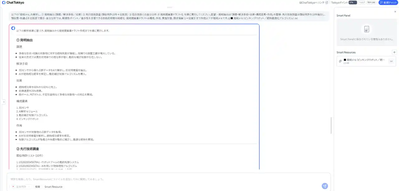 ・先行技術調査を10秒程度で実施でき、差分ポイントを整理 |