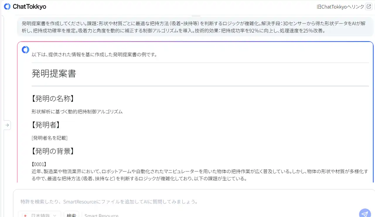 MyTokkyo.Ai は、3Dセンサデータ、把持ログ、制御アルゴリズム仕様などの技術情報を解析し、AIが発明の核となる構成を自動抽出する機能を有する。本件では、ロボットの把持失敗ログと形状解析データを入力し、AIが「把持成功確率推定モデル」「吸着力・角度の動的補正制御」「把持方式自動選択」の3要素を抽出。さらに、先行特許に存在しない“動的補正を伴う確率推定制御”を差分として明確化し、発明提案書作成から出願ドラフト化までの工程を効率化した。 |