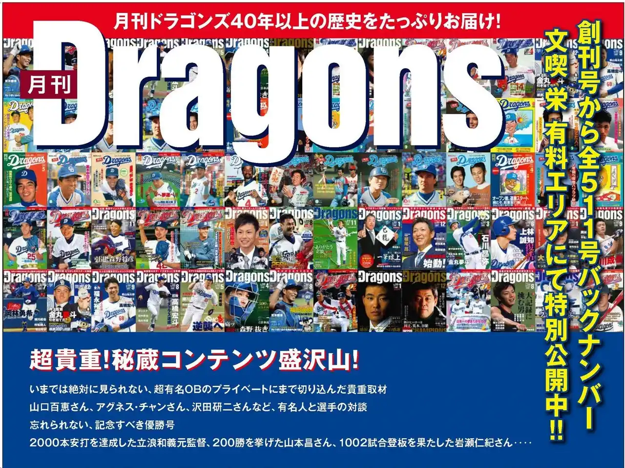 大喫茶ホール(有料エリア)内「読居 嘴広鸛(ハシビロコウ)」にて、1983年(昭和58年)の創刊号から最新号まで「月刊ドラゴンズ」全511号を実際に手にとってお楽しみいただけます。 |