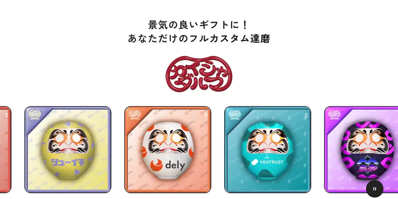 完全オーダーメイドで自由にデザインできる法人向け「カイシャダルマ」は、企業の移転祝いや周年記念の贈答品として支持され、法人間の贈答から誕生日祝いまで、新たな贈答シーンをデザイン・マーケティングの力で切り拓いています。 |