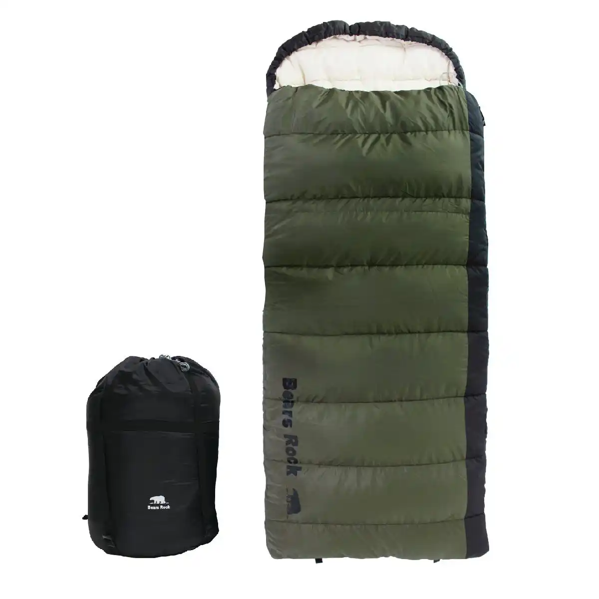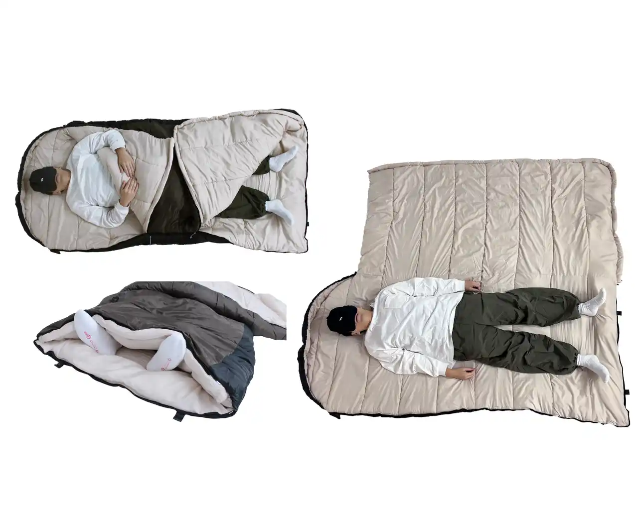 Bears Rockの寝袋はもともとゆとりあるサイズ感ですが、キングサイズはその中でもひときわワイド。体格の大きい方でも窮屈さを感じず、のびのびと快適に眠れます。 |