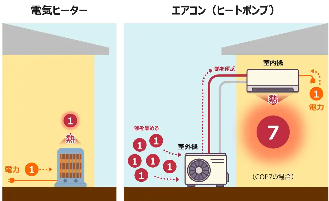 冬場に寒さを感じるのは空気中の「熱」が少ないからです。暖房器具は主に、室内の空気中にある「熱」を増やすことで室内を暖かくしています。一般的な電気ヒーターは電力をそのまま熱に変えるため、「1」の電力で「1」の熱をつくります。一方、ヒートポンプは、電力を使って屋外の空気中から熱を集める仕組みで「1」の電力で「3~7」の熱を生み出します。