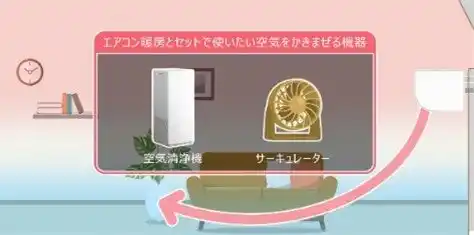 風向を下向きにしても、時間とともに温度ムラはできてしまいます。より温度ムラを抑えるには、空気清浄機やサーキュレーターなどの活用もおすすめです。エアコンと向かい合わせに置き、天井方向に風をおくります。室内の空気をかきまぜれば、さらに温度ムラがやわらぎます。気流をコントロールしながら、ムダな電力消費を抑えましょう。 |
