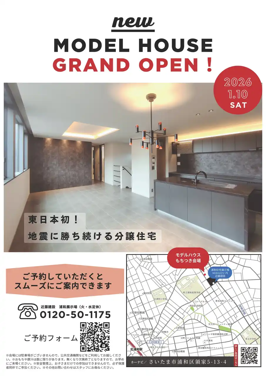KONDOグループの【近藤不動産株式会社】【近藤建設株式会社】(本社:埼⽟県ふじみ野市、代表取締役社長:宇佐見 佳之)は、CLTハイブリッド構法を採用した「地震に勝ち続ける」分譲住宅2棟【ロマンティア浦和領家】を建築いたしました(内訳:モデルハウス1棟、分譲販売住宅1棟)。2025年1月10日(土)に完成現場見学会&グランドオープンイベントを同時開催いたします。 |