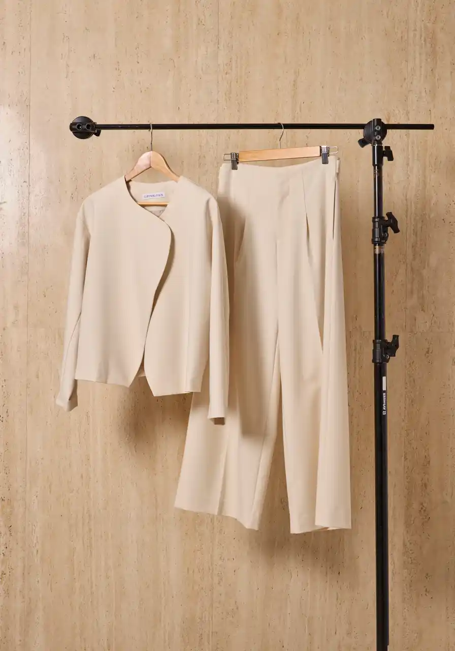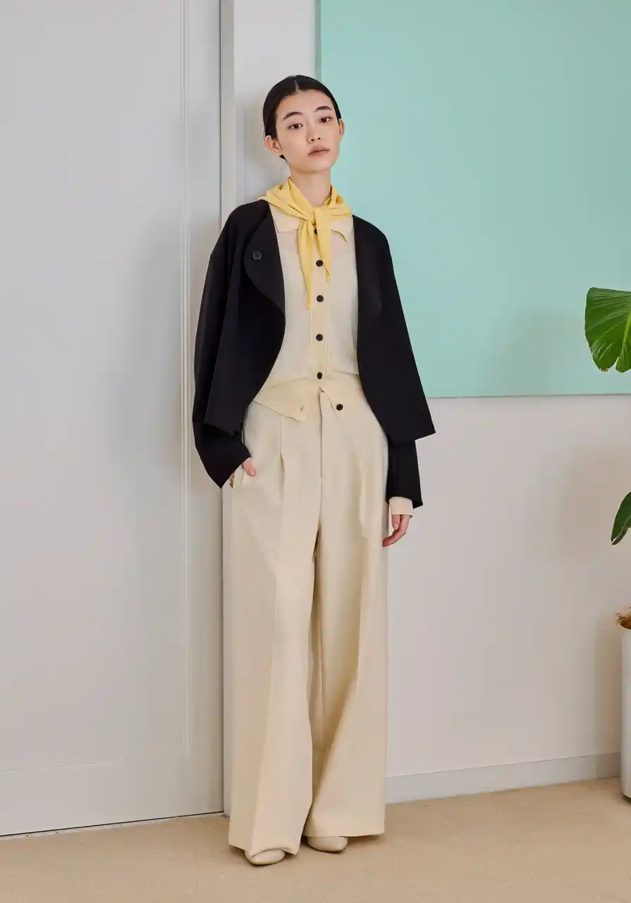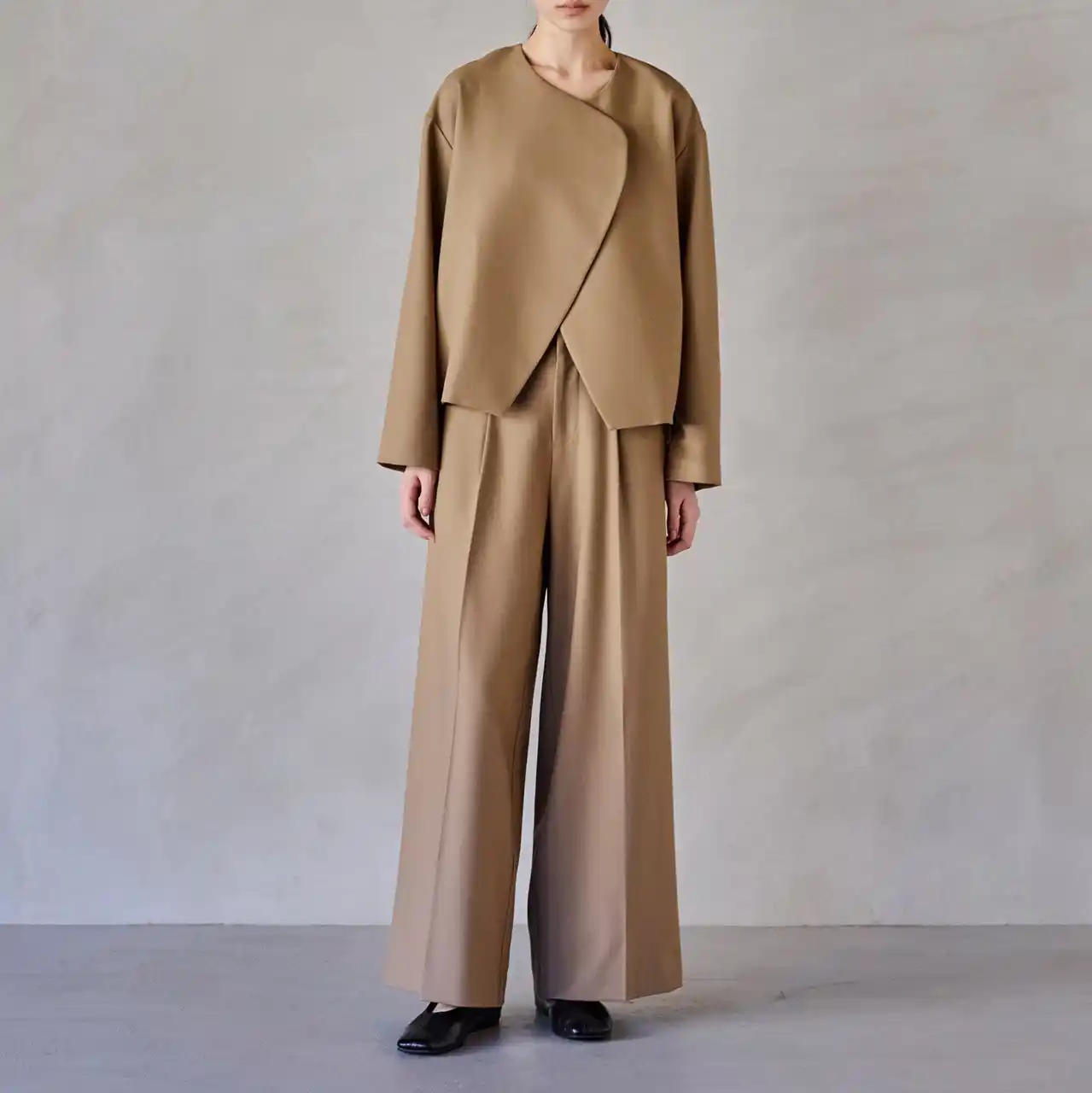 余分な装飾を排し、フォルムの美しさだけを際立たせたミニマルなセットアップ。ノーカラージャケットは、滑らかに重なるフロントラインが静かな強さを感じさせ、パンツはセンタープレスが描く直線が凛とした佇まいを生みます。ほどよい落ち感が体を包み込み、シルエットを計算されたままに整えてくれるのも魅力。フォーマルにもデイリーにも品よく馴染む、ワードローブの“軸”になるセットです。 |
