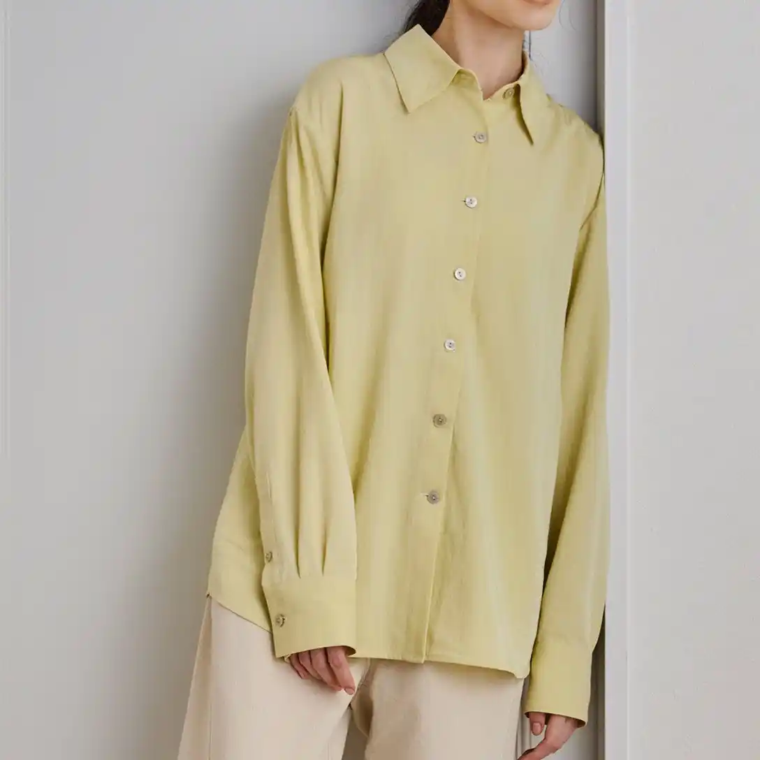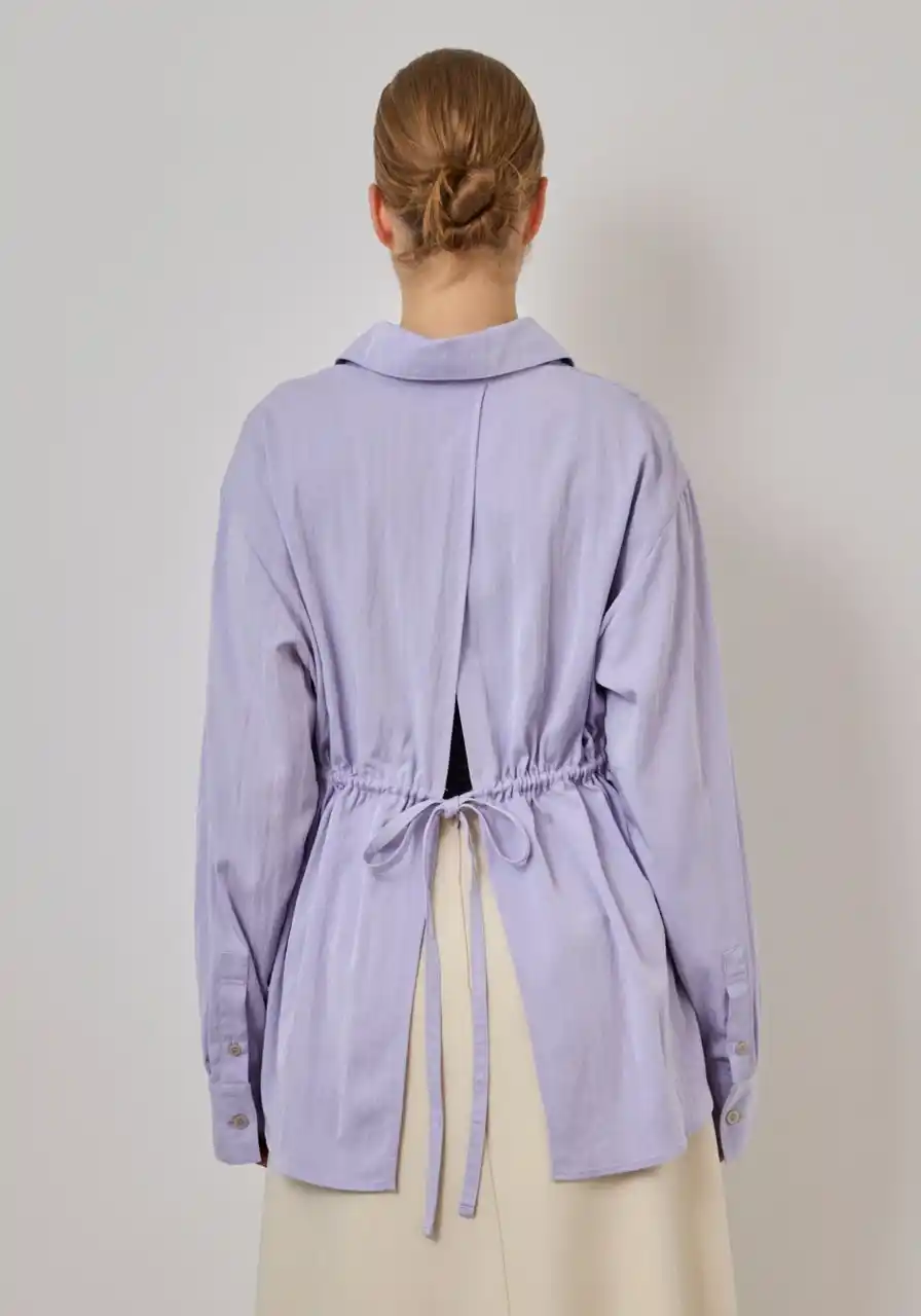ふわりと空気をまとったような、軽やかなブラウス。正面はあえてシンプルに、背中には大胆なスリットとドロストコードを配し、立体的なギャザーがモードな陰影を添えます。長めのカフスやシャープな襟元が全体を端正に引き締め、一枚で存在感のあるスタイルへと導いてくれる一着です。 |