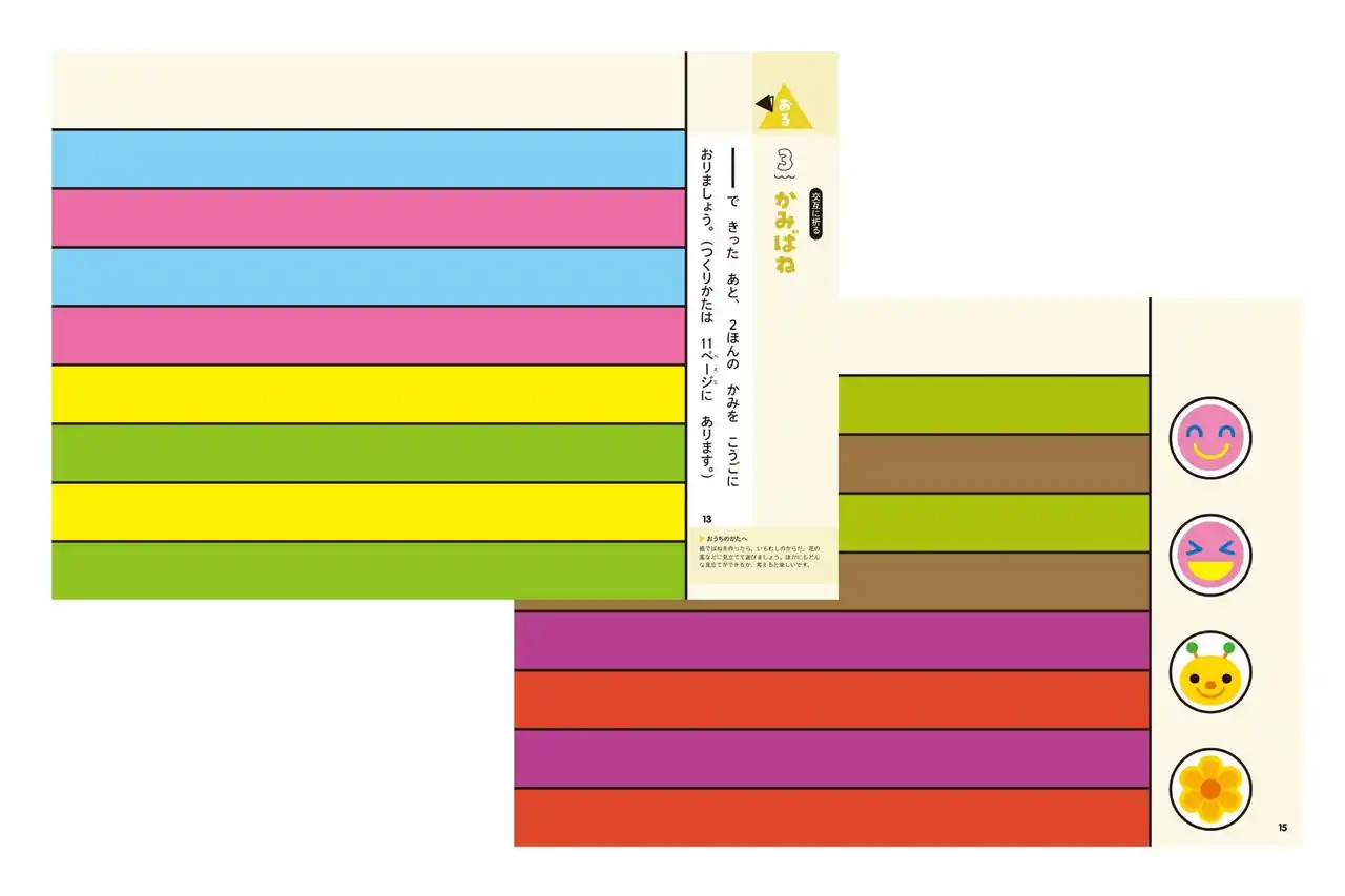 | それぞれの工作が色違いで何回分も収録されているので、色の組み合わせを自分で選択することができます。色彩感覚だけでなく、自己選択の力もぐんぐん伸びていきます。 | |||||||