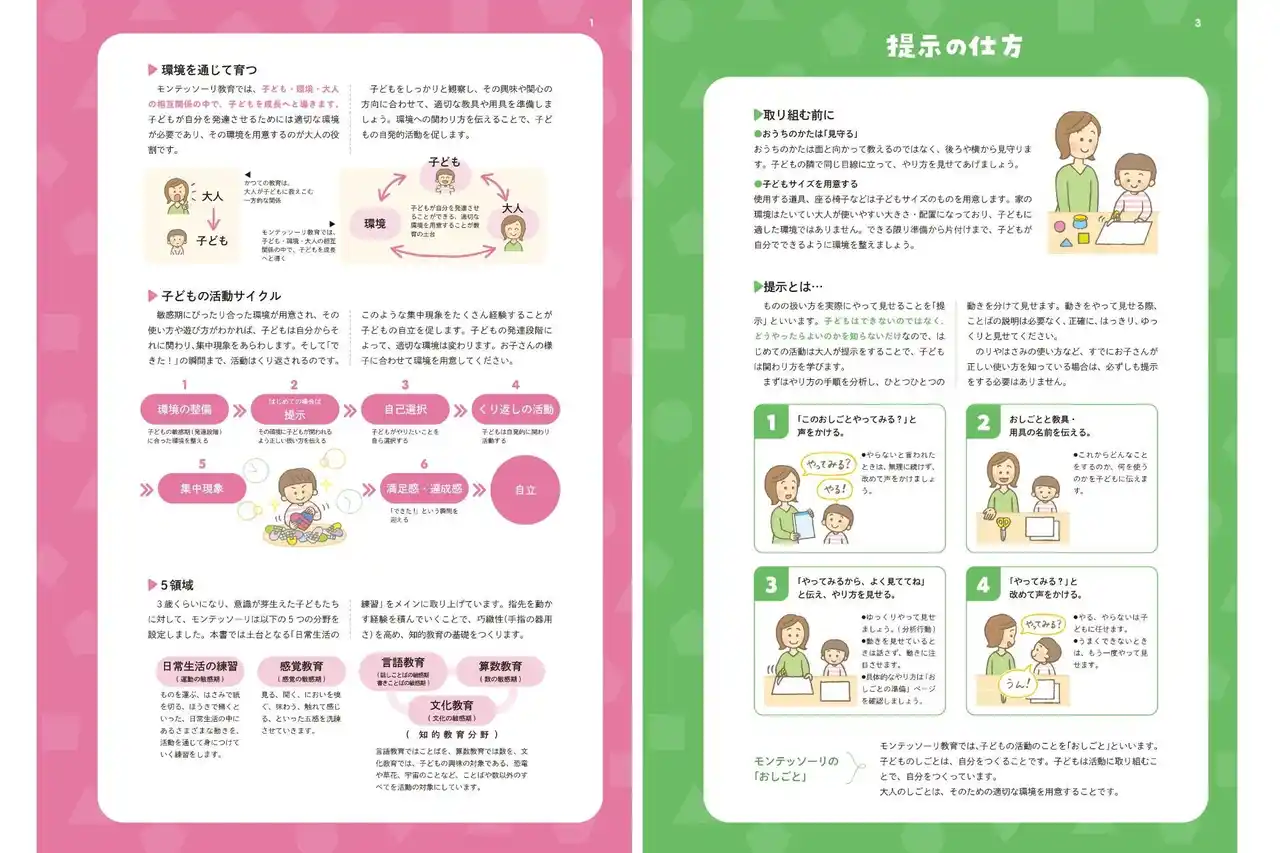 | 日本モンテッソーリ教育綜合研究所の監修による、保護者向け解説ページも充実。モンテッソーリ教育の基本的な考え方や提示の仕方について、イラスト付きでわかりやすく学ぶことができます。「モンテッソーリって、なんだか難しそう…」と感じている方も、安心して取り組める内容です。 | |||||||