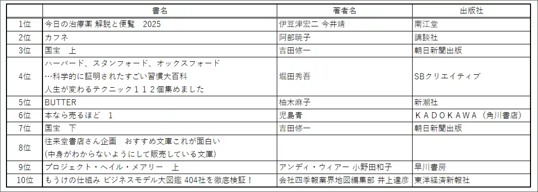 冊数ランキングでは、文庫作品の圧倒的な強さが際立つ結果となりました。ベスト10のうち、ほぼ全てが文庫またはコミックです 。金額ランキングでは1位に、医師・薬剤師の必携書である『今日の治療薬』がランクインし、専門書ニーズの高さも堅調であることを示しています。 |