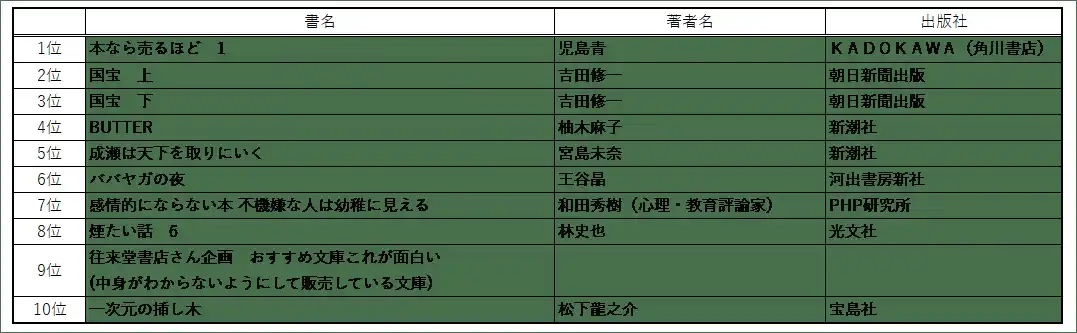 これは本の値段や、店舗でのイベントなどで、数字が大きく動きますので、さらに各店舗の特長がでるランキングかもしれません。 |