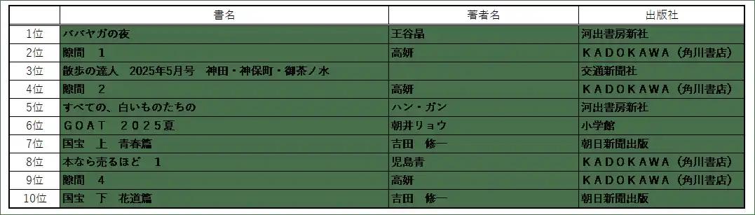 また興行収入が、邦画実写作品の歴代最高記録を22年ぶりに更新したことでも話題になっております『国宝 上・下』、イギリスのダガー賞受賞で話題になった『ババヤガの夜』が2店舗でランクインしました。ですがほとんどの作品は被っておらず、各店それぞれの個性が活きたランキングとなりました。 |
