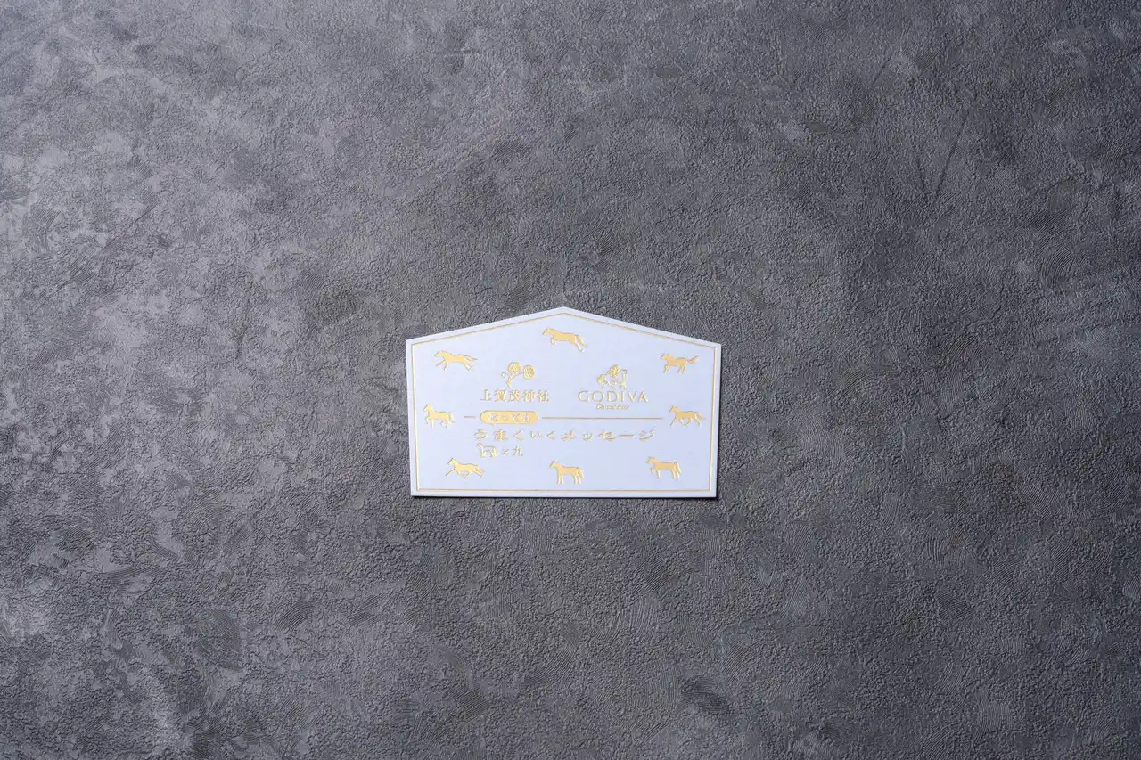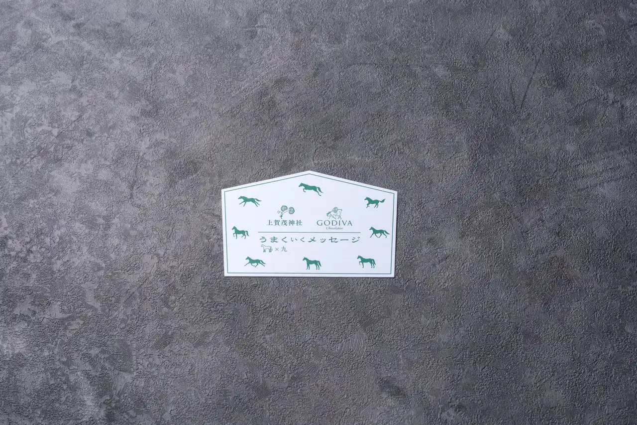 レディ・ゴディバをデザインしたホワイトチョコレートに、淡いブルーのハートが付いていたら、大当たり。とってもうまくいく一年となるでしょう。上賀茂神社のメッセージが書かれた、“9頭の馬が行く”で“うまくいく”と、シャレの効いた絵馬形カードは、午年の縁起物としてお持ちください。 |