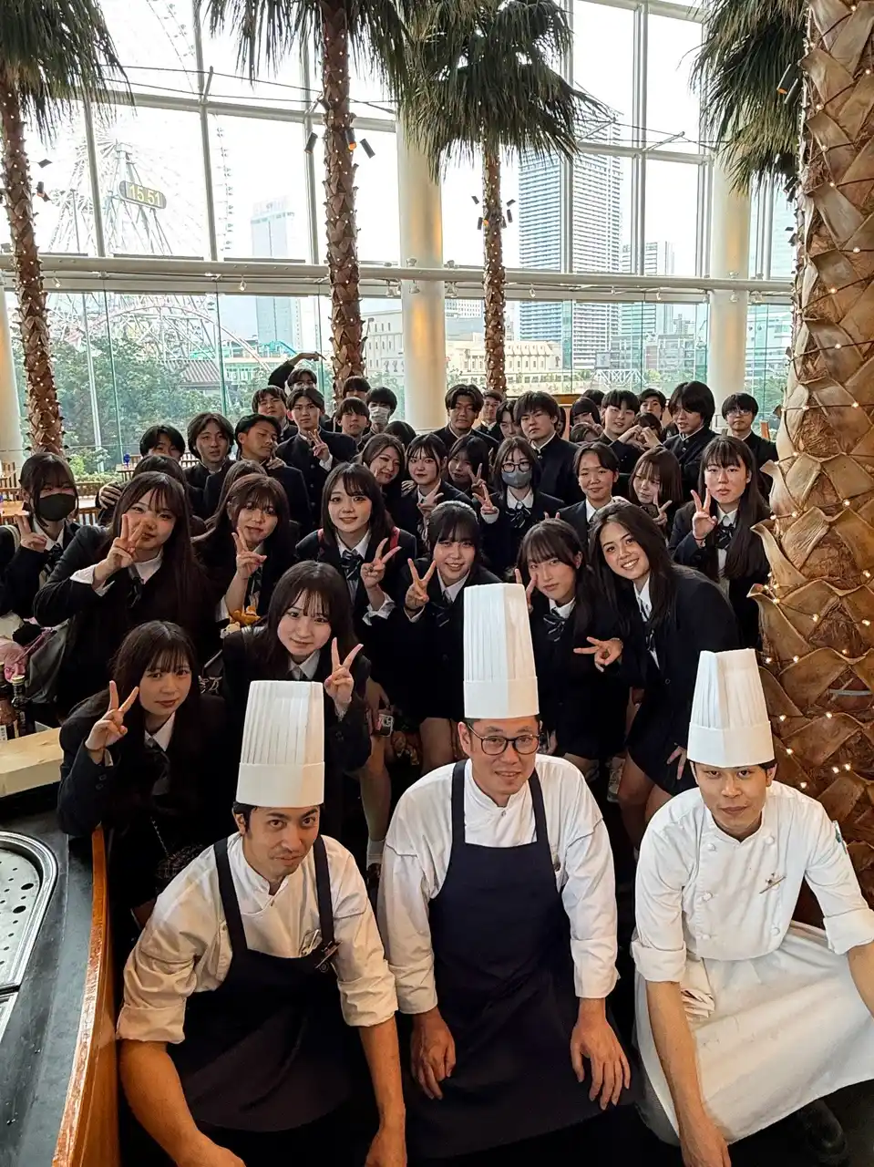 カフェトスカ店内にて、生徒の皆さんとシェフとの集合写真 |