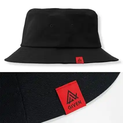 「ギヴン」バンドデザインのオリジナル織りネームタグを施したコットンツイルのバケットハット。 |