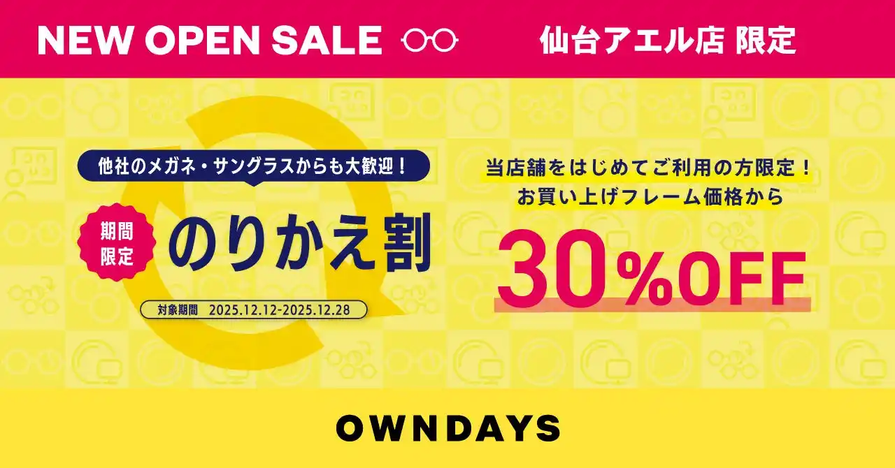 | 12月12日(金)~28日(日)まで、当店舗(仙台アエル店)を初めてご利用いただくお客様を対象に「のりかえ割」を実施いたします。期間中、フレーム1本とレンズのセットを税込14,000円以上ご購入いただくと、お会計金額から30%OFFとなります。新しくオープンするこの機会に、ぜひOWNDAYSのメガネをお試しください! | ||||||||||||||