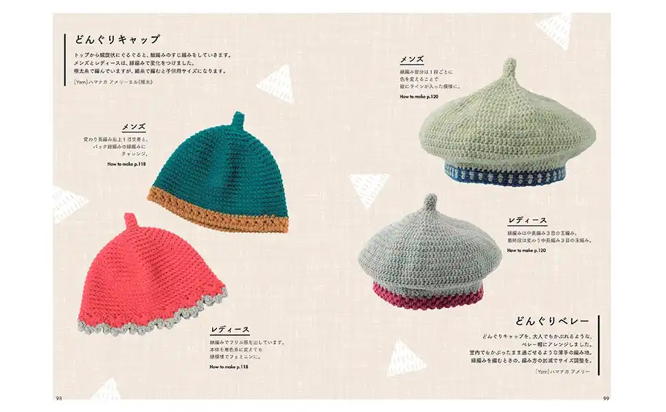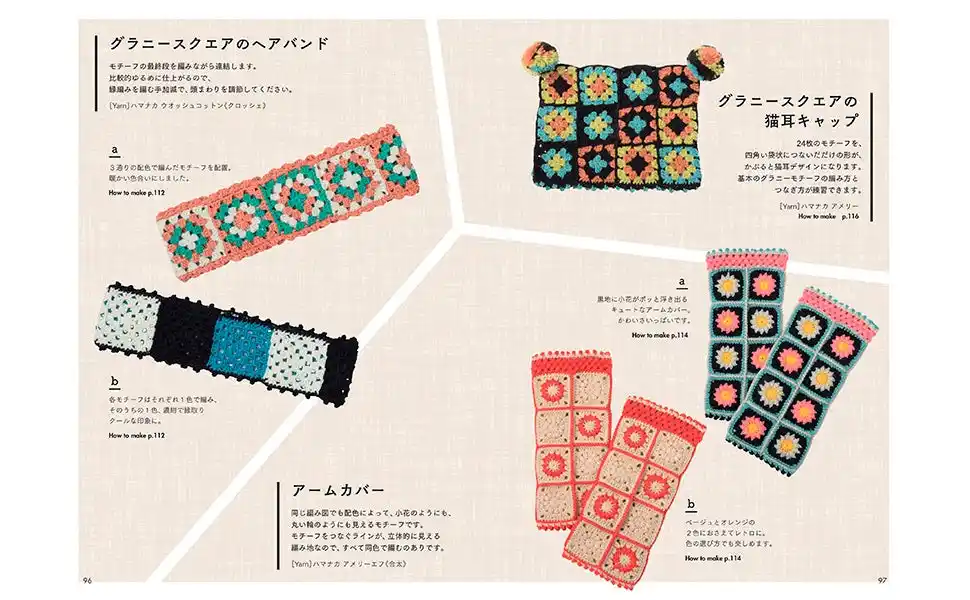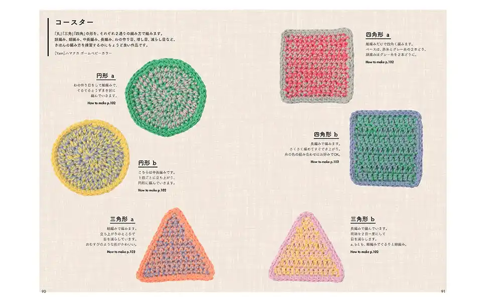 基本の編み方の練習にもなるコースターから、流行りのグラニースクエアアイテムまで、掲載作品18点。全部編めたころには、右利き用の編み図の作品もばっちり編めるようになっているはずです! |