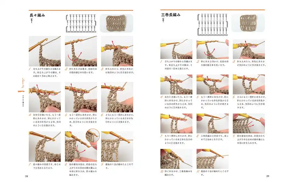 かぎ針の持ち方からはじまり、模様編みやコード編み、糸の始末まで、63種類の編み目記号と22種類の編み方テクニックを掲載。 |