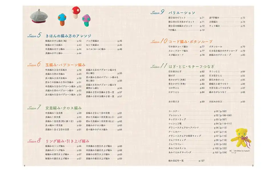 針の持ち方/基本の編み方/増し目/減らし目/基本の編み方のアレンジ/玉編み/パプコーン編み/交差編み/クロス編み/リング編み/引き上げ編み/ピコット/方眼編み/ネット編み/コード編み/モチーフ編み など全85種類の編み方 |