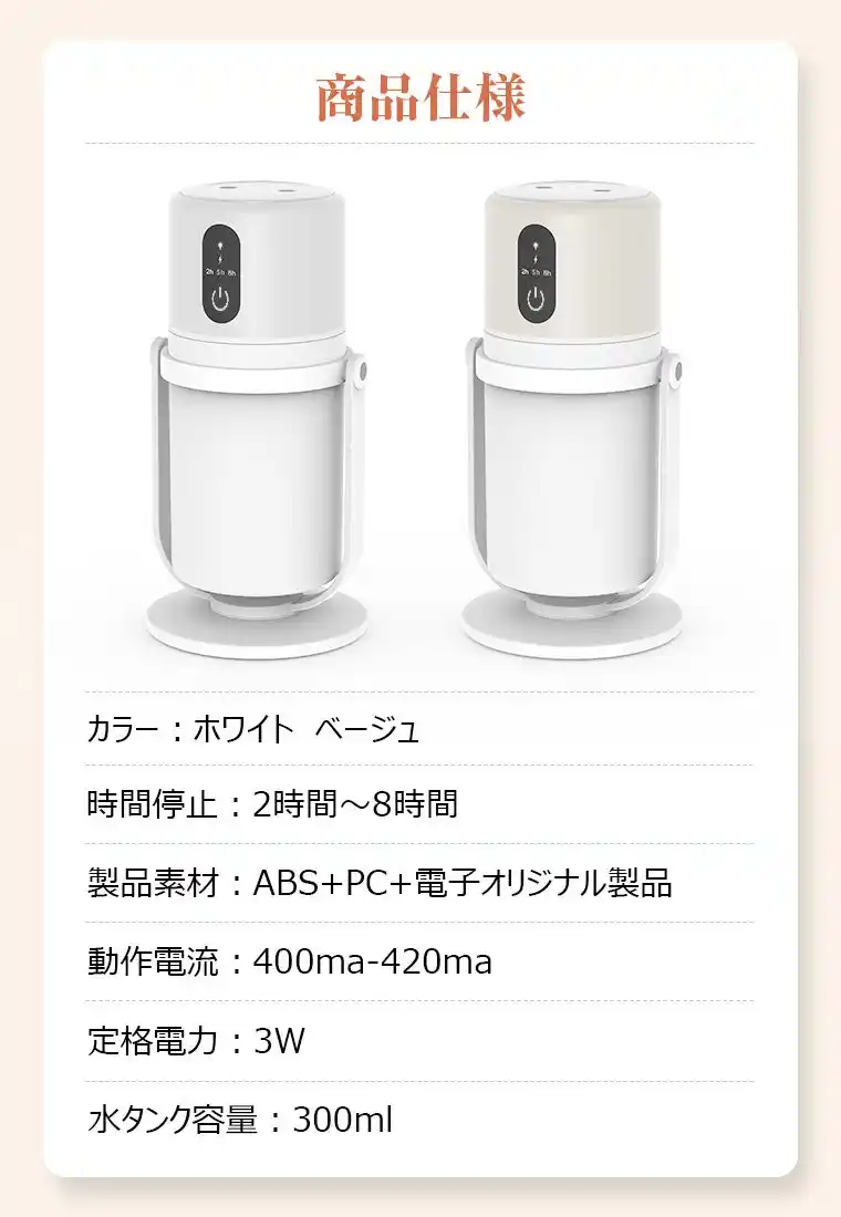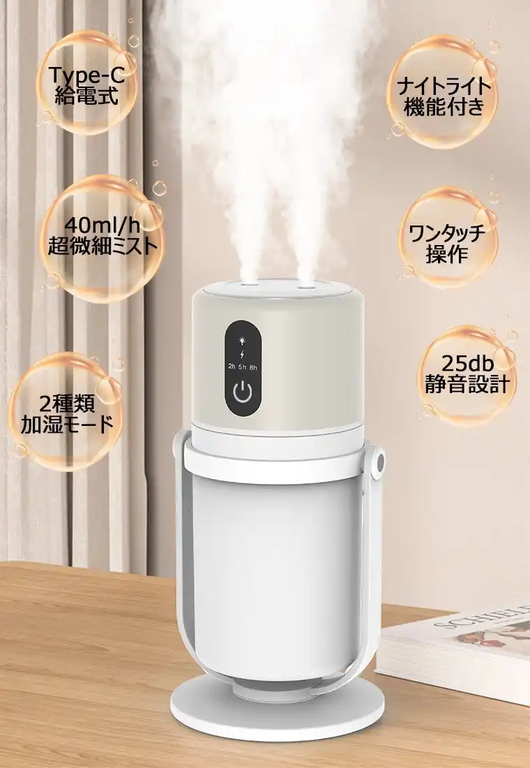 2つのノズルで加湿量アップ、さらにワイヤレス仕様で車内・外出先でも使える自由度の高いモデル。 キャンプや車内移動の多いユーザーにも人気。 |