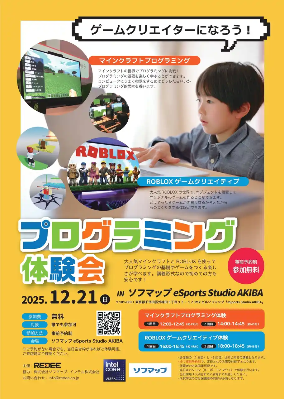 REDEE株式会社(本社:京都府京都市、代表取締役:密山裕貴)は、株式会社ソフマップ、インテル株式会社の協力のもと、2025年12月21日(日)に、マインクラフトおよびROBLOXを使った「ゲームクリエイター体験会」を開催します。会場は、ソフマップ eSports Studio AKIBA(東京・秋葉原)。 |