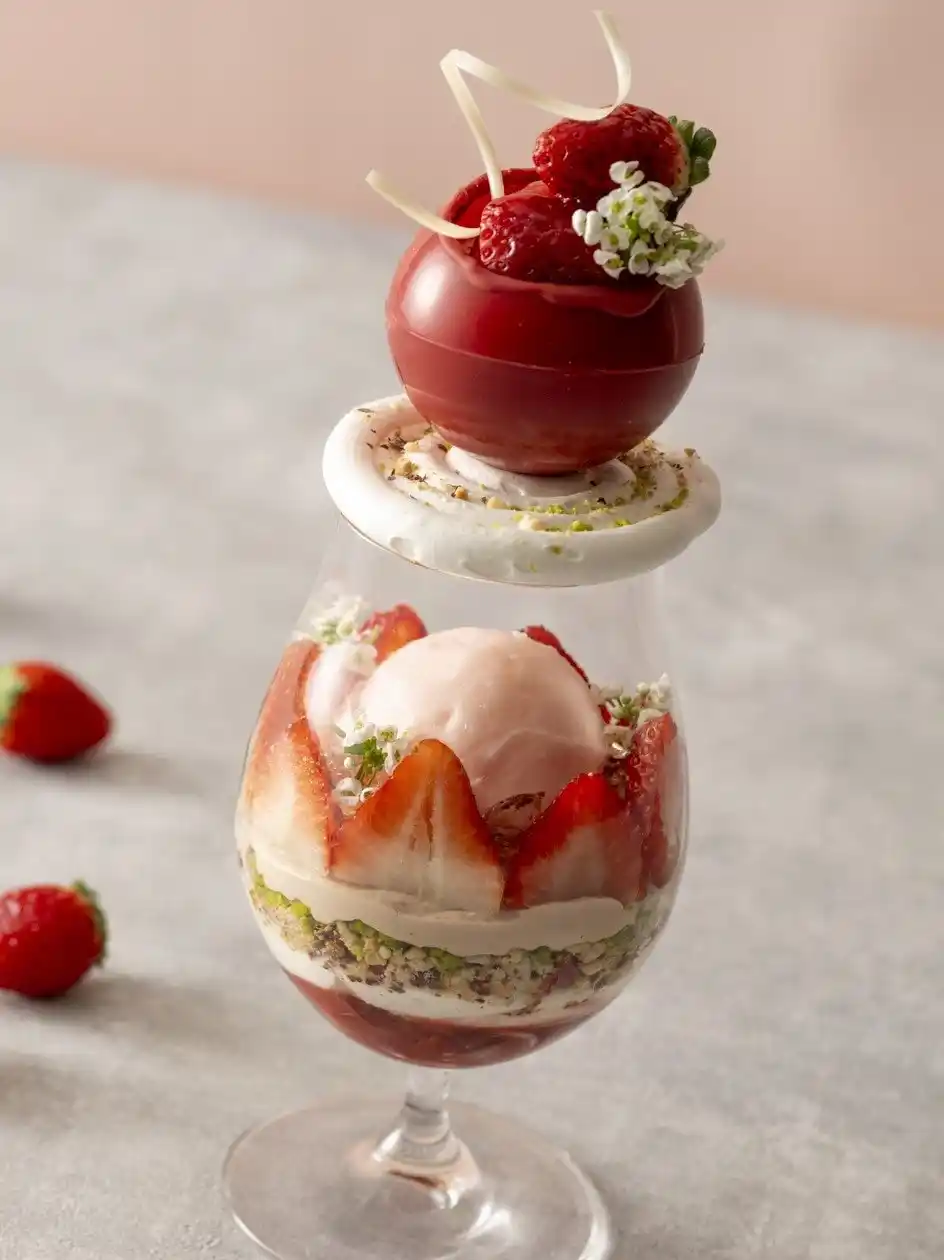 グラスの中央には、フレッシュな甘酸っぱさを楽しめるいちごのアイスクリームに、いちごと相性の良いまろやかなミルクチョコレートガナッシュ、ドライストロベリーやピスタチオ、アーモンドなどを重ね、食感のハーモニーをお楽しみいただけます。また、グラスの下層にはフレッシュないちごやさまざまなベリーがライチ酒のジュレとともに満たされており、マスカルポーネチーズとレモンのなめらかなシャンティや間にあるパリッとした板チョコレートとともに味わうと、いちごの爽やかさにまろやかさが加わり、上品な余韻が重なります。 |