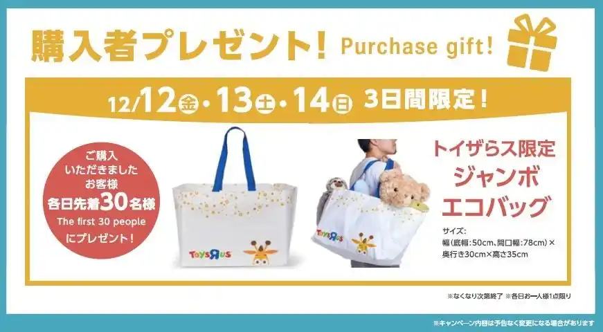 オープンを記念して、『トイザらス イオンモール宮崎店』では12月12日(金)~14日(日)の3日間、商品をご購入いただいた各日先着30名様に、トイザらス限定ジャンボエコバッグをプレゼントいたします。詳細については当社ウェブサイトのイベント情報ページ(URL:https://www.toysrus.co.jp/ja-jp/events/event-223.html)をご覧ください。 |