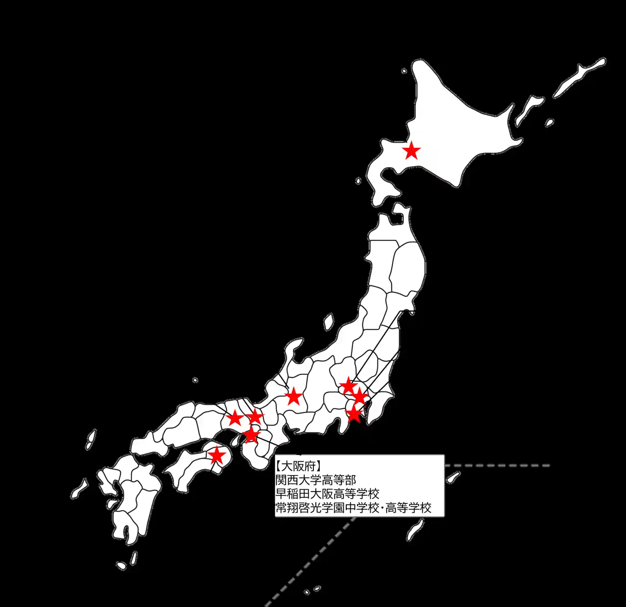 芝国際中学校・高等学校(東京都)、横浜清風高等学校(神奈川県)、埼玉県立浦和商業高等学校(埼玉県)、岐阜県立岐阜高等学校(岐阜県)、立命館中学校・高等学校(京都府)、関西大学高等部(大阪府)、早稲田大阪高等学校(〃)、常翔啓光学園中学校・高等学校(〃)、神戸龍谷中学校高等学校(兵庫県)、徳島市立高等学校(徳島県) |