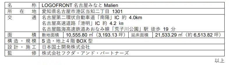 みずほリース株式会社の100%子会社であるエムエル・エステート株式会社(以下「MLE」)は、名古屋市内にて新築物流施設を取得しましたのでお知らせいたします。MLEの物流施設ブランド「Malien Logistics(マリエン ロジスティクス)」から「Malien(マリエン)」を加えた施設名称「LOGIFRONT名古屋みなとMalien」(以下「本物件」)として運用を開始いたします。 |