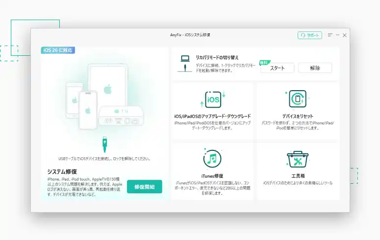AnyFixは、iPhoneやiPadの起動不良、アップデート失敗、リンゴループ、再起動ループ、iTunesの接続エラーなど、150種類以上のiOS関連トラブルに対応した修復ソフトです。複雑な手順や専門知識は不要。数クリックで問題を検出し、最適な修復モードを自動選択します。システムの初期化なしに修復できるため、大切なデータを守りながら不具合を解消できます。 |