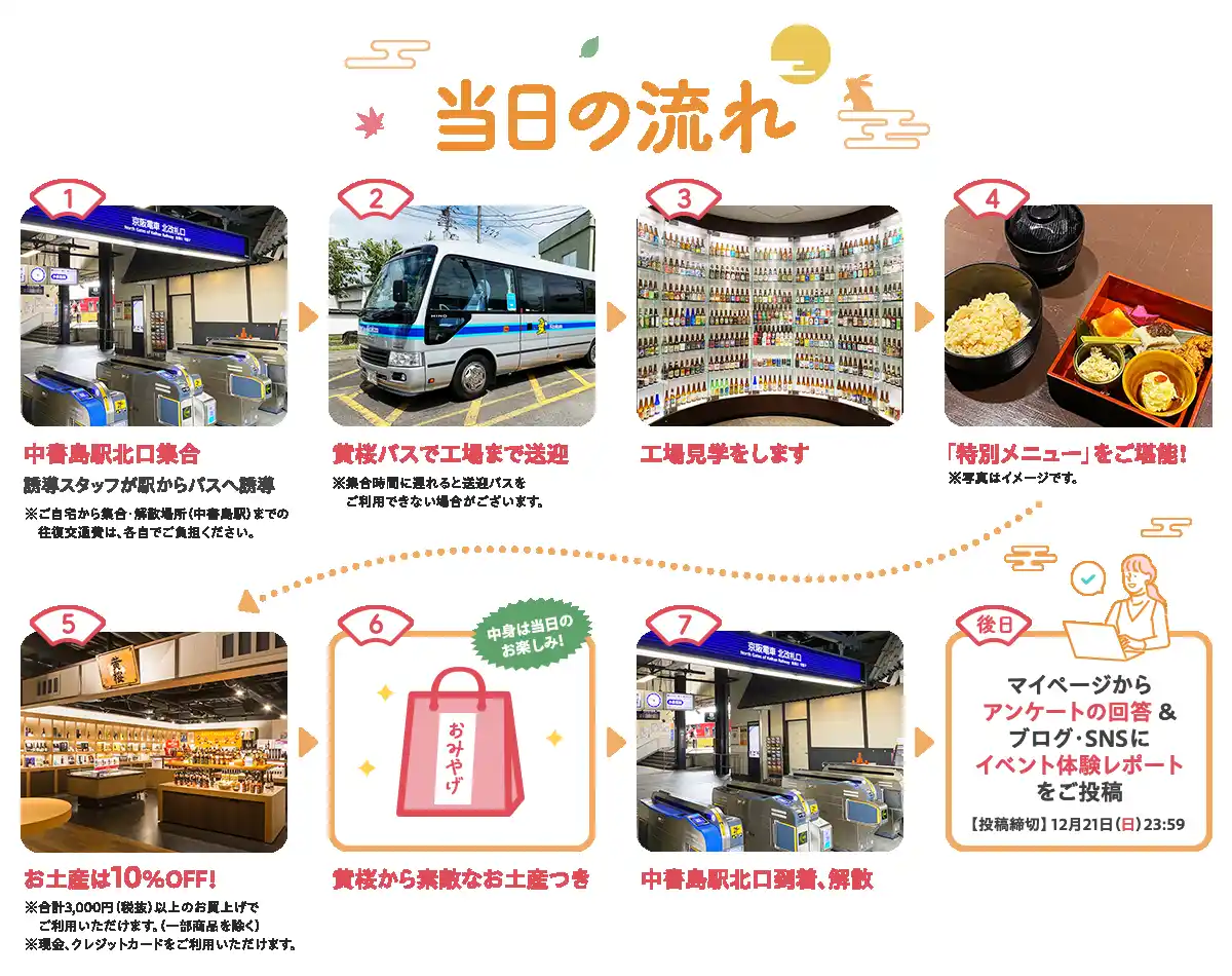 「そうだ 黄桜 伏水蔵 行こう。」は、黄桜株式会社(本社:京都市伏見区、代表取締役社長:松本真治 以下「黄桜」)に協賛いただき、「サンプル百貨店」のインフルエンサー会員に向けた「黄桜 伏水蔵」の体験ツアーイベントです。酒造り見学や試飲体験で黄桜ブランドの認知拡大を図るとともに、SNSの情報発信を通じてその魅力を伝えることで、さらなるファンの獲得を目的としています。 |