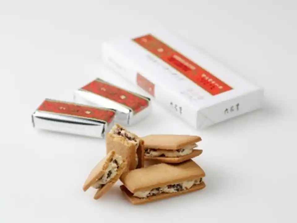 ホワイトチョコレートと北海道産生乳100%のバター、そしてカリフォルニア産のレーズンをあわせたクリームをビスケットでサンドした、ロングセラー商品。 |