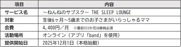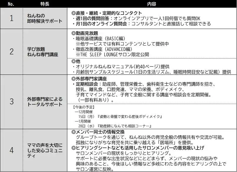 | 「THE SLEEP LOUNGE(ザ・スリープ・ラウンジ)」は、生後6ヶ月から5歳までのお子さまを持つ保護者を対象とし、BABY SLEEP SCHOOLが培ってきた9年の実績をもとにした子どもの睡眠の情報だけでなく、授乳・離乳食・ママの栄養や産後のボディメイクなど、ママが抱える幅広い育児の悩みに応える「ママのための居場所」として、陽子&祐子に加え外部専門家も交えて多角的なサポートを提供します。 | |||||||||||||||||||