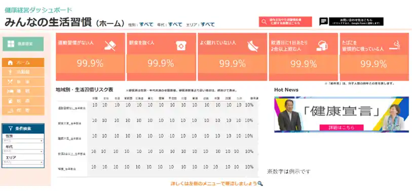 | 損保ジャパンでは、これまで収益や事業基盤に関する指標・推移を中心に全社員に公開してきましたが、この度、新たに「健康経営ダッシュボード」を新設し、社員の生活習慣(運動、食事、睡眠、飲酒、喫煙など)や健康アンケートの結果を集約・可視化しました。これにより、社員は全社やエリアごとの性別・年代別の傾向を客観的に把握することが可能となり、社員の主体的な健康管理を促進します。 | |||||||||