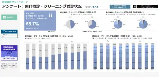 | さらに、人生100年時代を見据え、社員の歯の健康維持を支援するため、歯科の通院状況に関する健康アンケートの結果もダッシュボードに掲載しました。ダッシュボード上で、健康保険組合が提供する無料歯科健診の案内も確認できるため、社員の予防意識向上を促進します。 | |||||||||