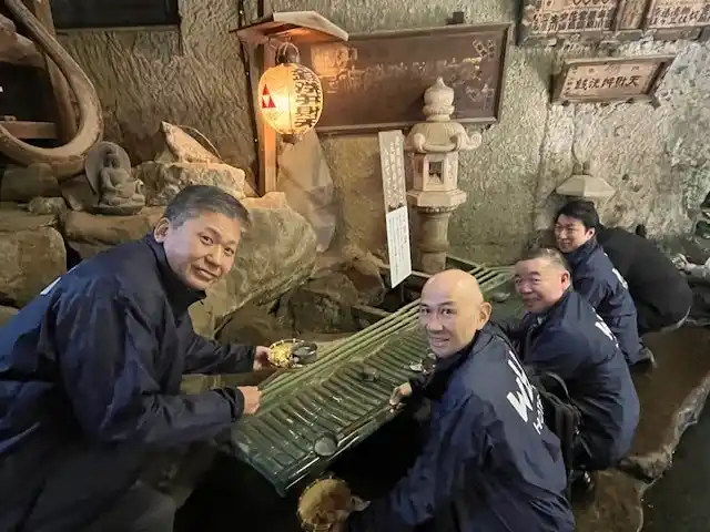 5円玉を銭洗弁財天宇賀福神社で清める支配人たち |